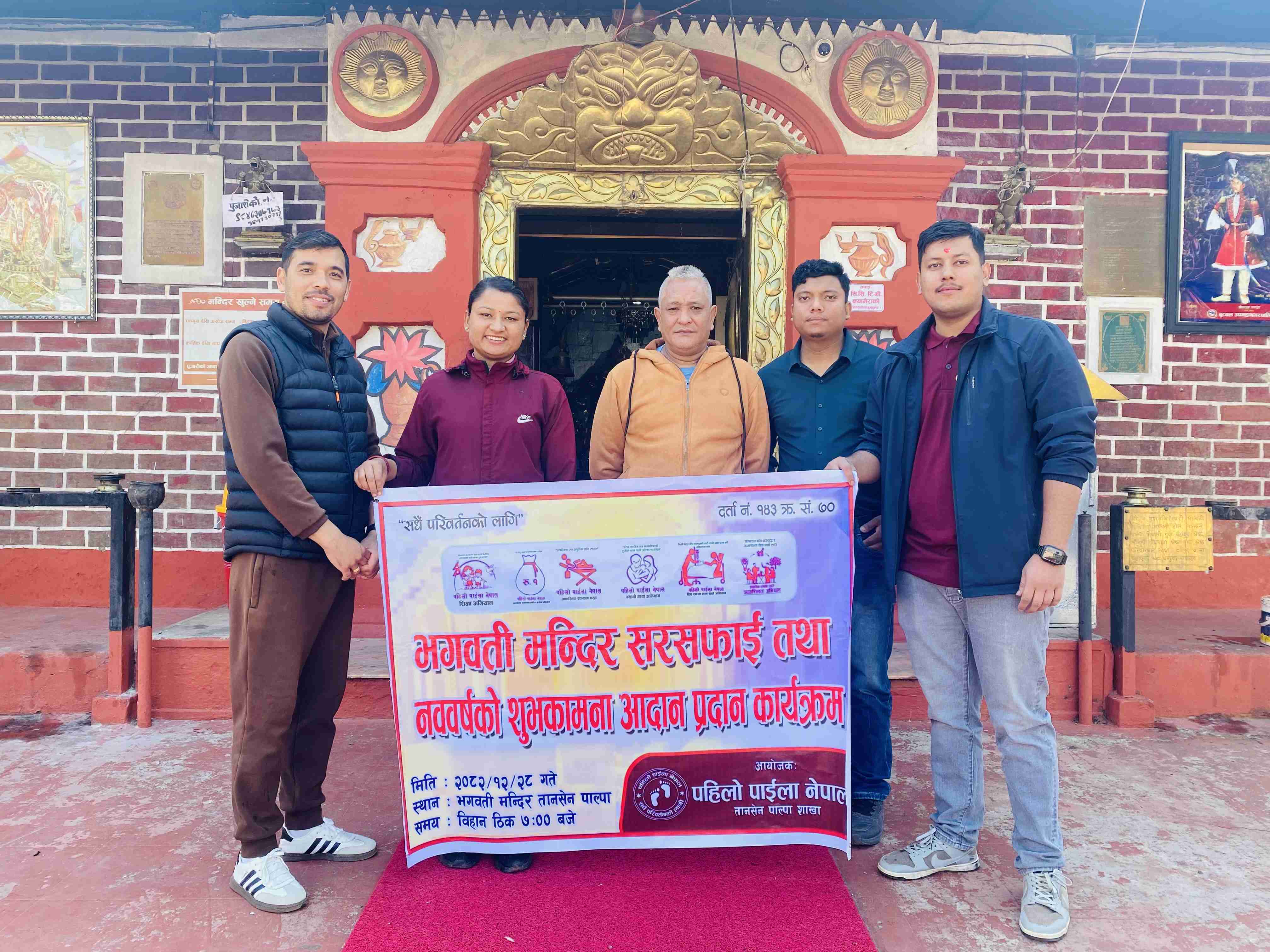पाल्पा जिल्लामा सामाजिक कार्यमा सक्रिय संस्था पहिलो पाइला नेपाल तानसेन शाखाद्वारा ऐतिहासिक तथा धार्मिक महत्व बोकेको भगवती मन्दिर परिसरमा सरसफाइ कार्यक्रम सम्पन्न गरिएको छ । राष्ट्रिय वीरता, धीरता र रणकौशलको गौरवपूर्ण इतिहाससँग सम्बन्धित यस पवित्र स्थलमा सम्पन्न उक्त कार्यक्रमले सामाजिक उत्तरदायित्वको उच्च उदाहरण प्रस्तुत गरेको छ । संस्थाले वातावरण संरक्षण, धार्मिक स्थलप्रति सम्मान अभिवृद्धि तथा समुदायमा सचेतना फैलाउने उद्देश्यका साथ सरसफाइ अभियान सञ्चालन गरेको जनाएको छ । कार्यक्रममा सहभागी महानुभावहरूले मन्दिर परिसरमा रहेका फोहोर संकलन गरी स्वच्छता कायम गर्न महत्वपूर्ण योगदान पुर्याउनुभएको थियो ।