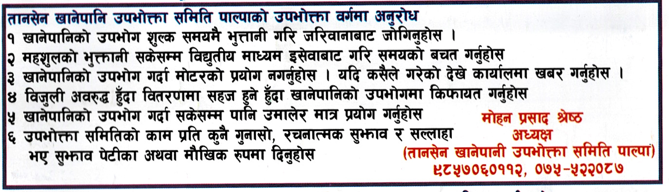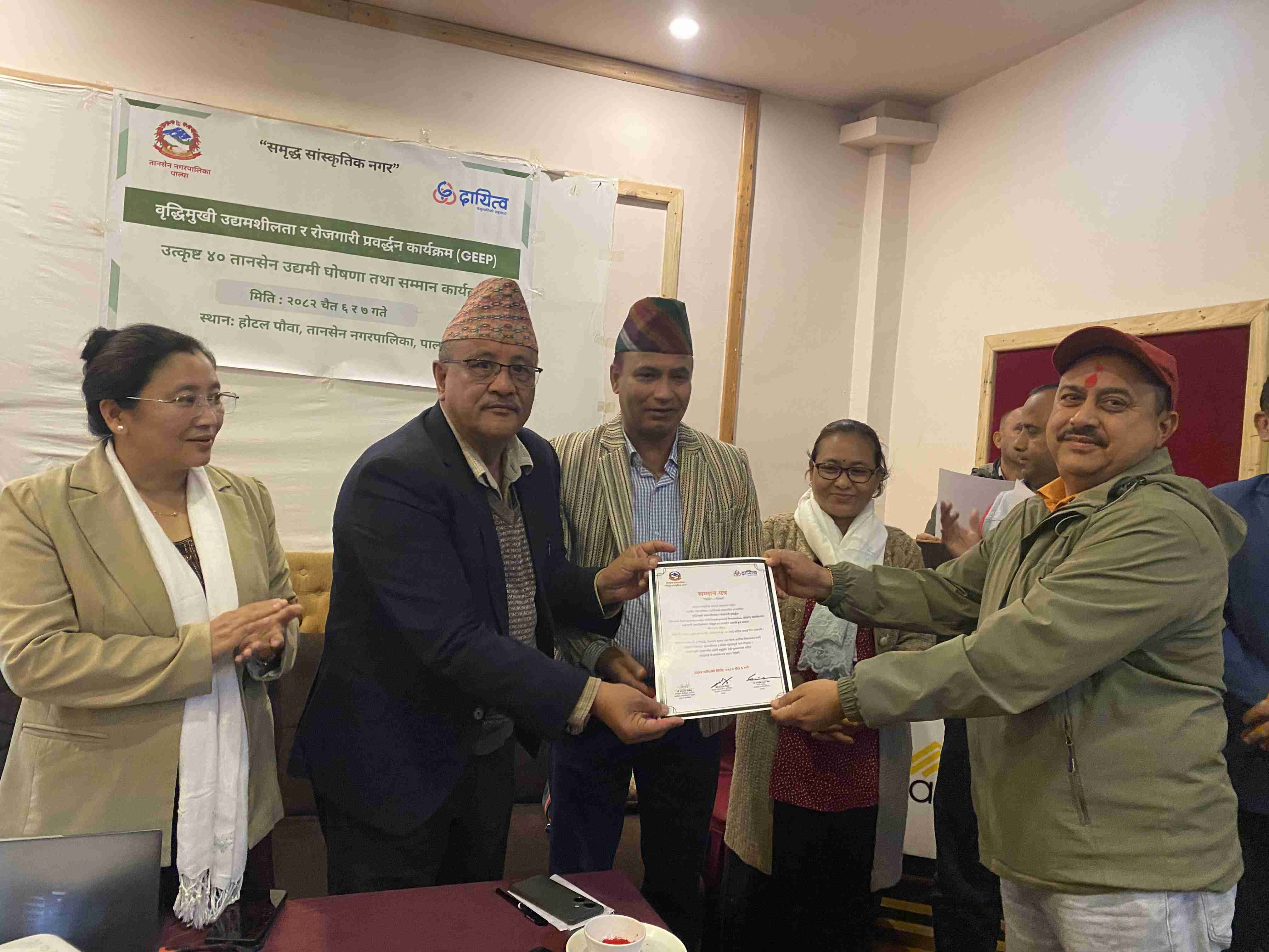 पाल्पा- तानसेन नगरपालिकाको आयोजना तथा दायित्वको सहकार्यमा सञ्चालित “वृद्धिमुखी उद्यमशीलता तथा रोजगारी प्रवर्द्धन कार्यक्रम (GEEP)” अन्तर्गत तानसेन नगरपालिकाभित्रका उत्कृष्ट ४० जना उद्यमीहरूलाई एक विशेष समारोहका बीच सम्मानित गरिएको छ। स्थानीय स्तरमै उद्यमशीलताको विकास, रोजगारी सिर्जना र आर्थिक सशक्तीकरणमा महत्वपूर्ण योगदान पुर्याउनुभएका उद्यमीहरूलाई सम्मानित गर्दै आयोजना गरिएको उक्त कार्यक्रमले नगर क्षेत्रका व्यवसायीहरूलाई थप हौसला प्रदान गरेको छ । कृषि, पर्यटन, हस्तकला, सेवा तथा उत्पादनमूलक क्षेत्रका उद्यमीहरूलाई छनोट गरी सम्मानित गरिएको कार्यक्रममा सहभागी उद्यमीहरूले आफ्नै मेहनत र नवीन सोचमार्फत स्थानीय स्रोत साधनको सदुपयोग गर्नुभई उदाहरणीय कार्य गर्नुभएको छ ।