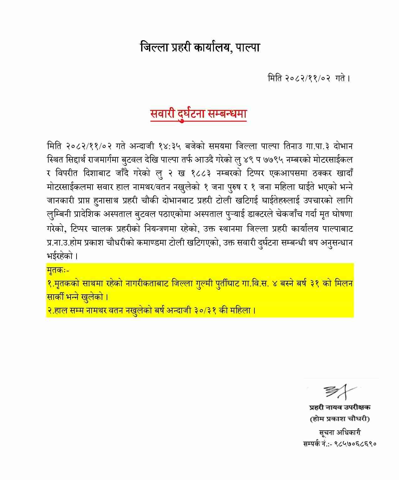 पाल्पा÷तिनाउ गाउँपालिका–३, दोभान पाल्पामा टिप्परको ठक्करबाट दुई जनाको मृत्यु भएको छ। बुटवलदेखि पाल्पातर्फ आ...