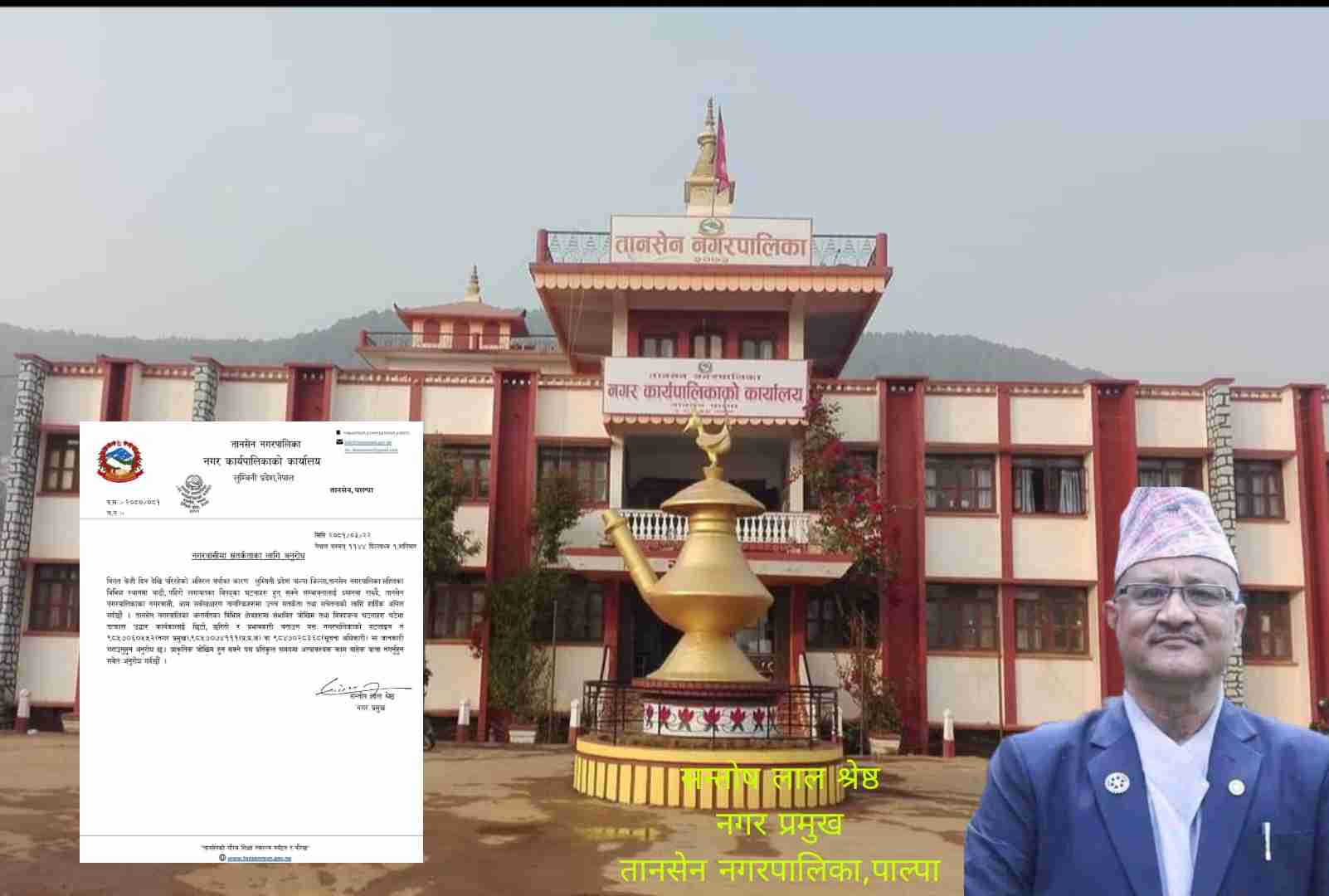 पाल्पा- तानसेन नगरपालिकाका नगर प्रमुख सन्तोष लाल श्रेष्ठ नगरवासीलाई सतर्कता अपनाउनुहुन अनुराेध गर्नु भएको छ । नगर प्रमुख...
