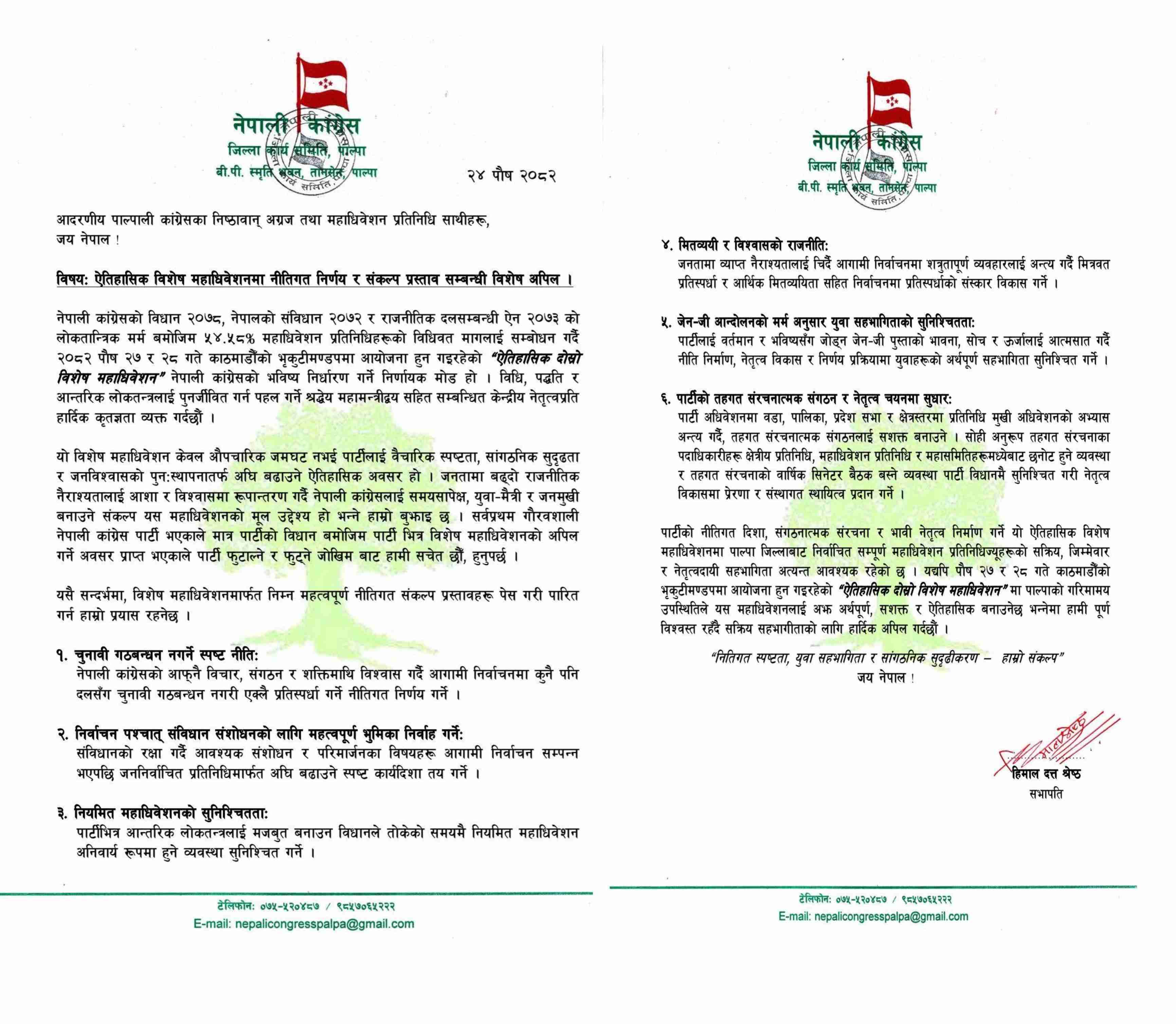 नेपाली कांग्रेस पाल्पा पनि विशेष महाधिवेशनको पक्षमा उभिएको छ। जिल्ला सभापति हिमालदत्त श्रेष्ठले विज्ञप्ति जारी गर्दै प्र...