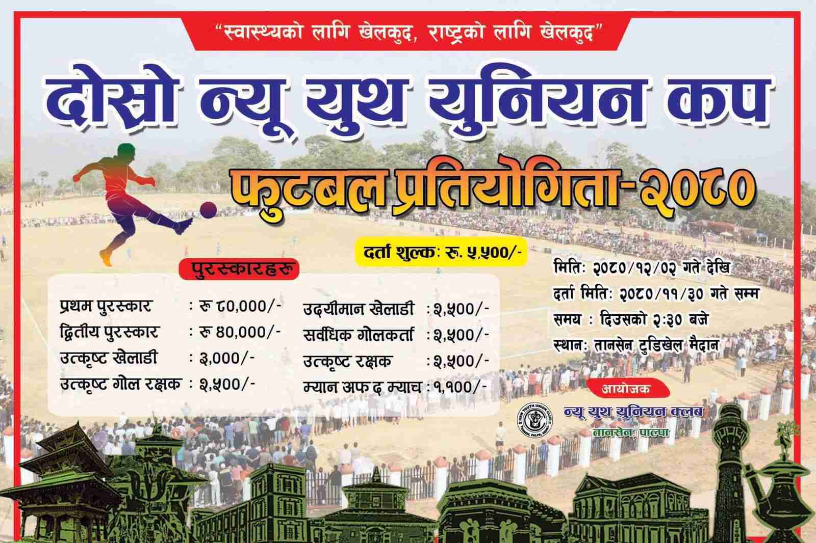 पाल्पा-न्यु युथ युनियन क्लब तानसेन पाल्पाकाे आयाेजनामा चैत ६ गते देखि दाेस्त्राे न्यु युथ युनियन कप हुने भएको छ । त...