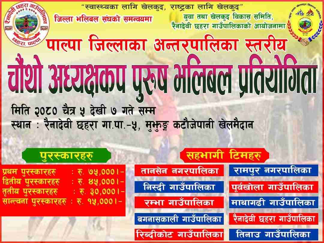 पाल्पा- पश्चिम पाल्पाको रैनादेबी छहरा गाउँपालिका युवा तथा खेलकुद विकास समितिले पाल्पा जिल्लाका अन्तरपालिका स्तरीय चाैथाे...