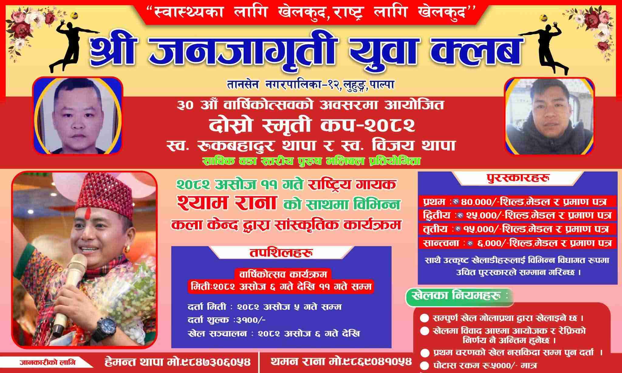 सुमन बाकाबल पाल्पा- तानसेन नगरपालिका–१२ लु्हुङगमा रहेको श्री जनजागृति युवा क्लबले आफ्नो ३० औँ वार्षिकोत्सवक...