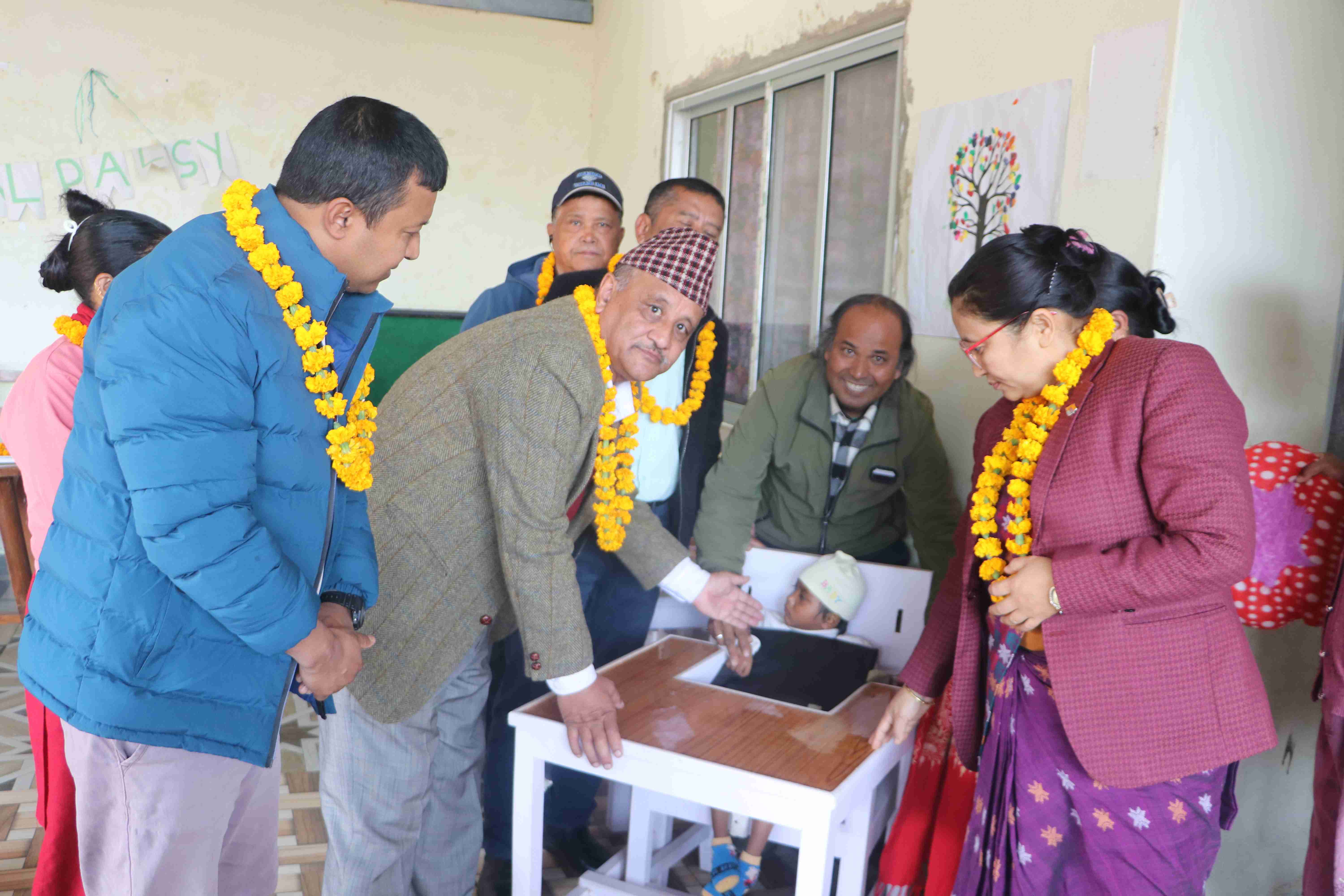 पाल्पा-तानसेन नगरपालिका वडा नम्बर २ मा रहेको डे केयर सेन्टरमा फरक क्षमता भएका विद्यार्थीहरूको लागि अपाङ्गमैत्री टेबल-कुर...
